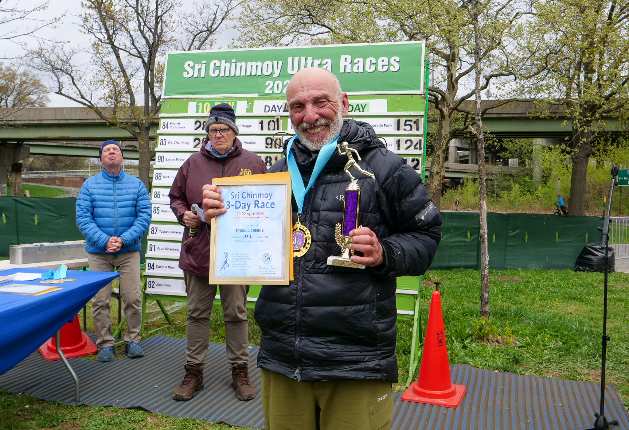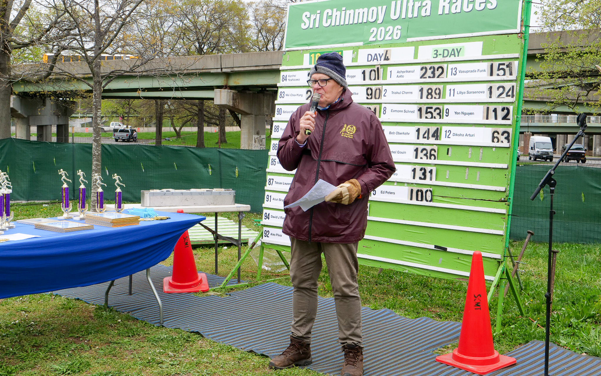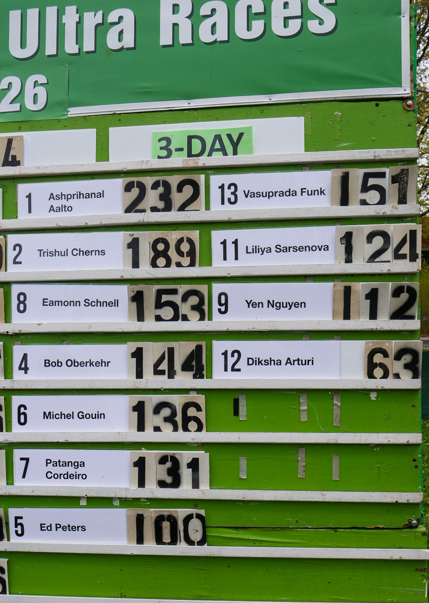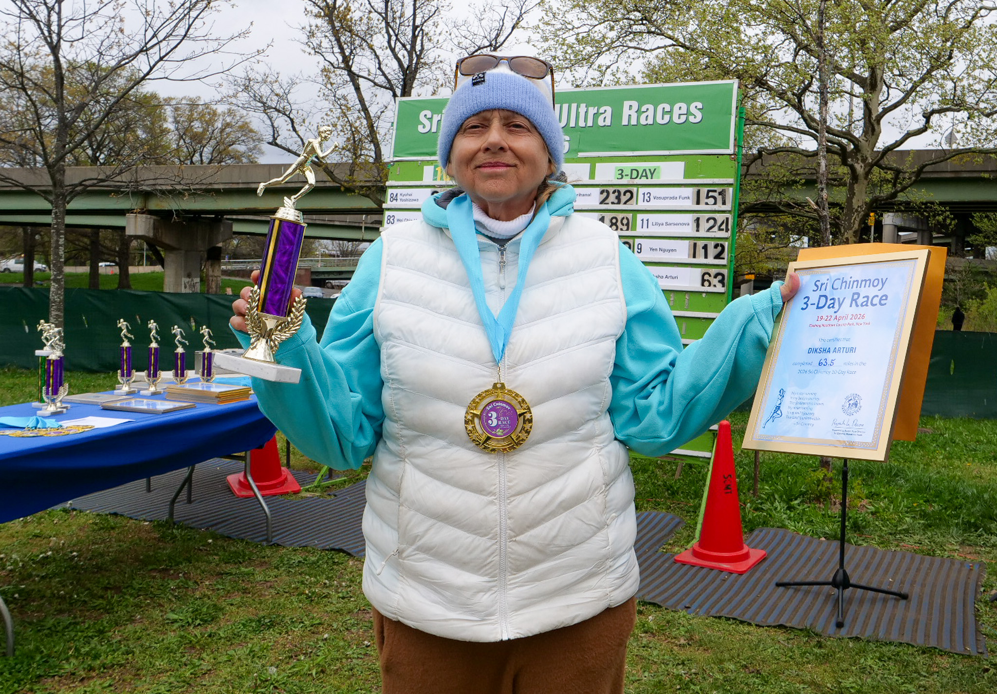 3 Day Race Results and PicturesDiksha Arturi 4th place 63.6 milesYen Nguyen 3rd place 112 milesLiliya Sarsenova 2nd place 125 milesVasuprada Funk 1st place 151 milesPatanga Cordeiro 6th place 131 milesMichel Gouin 5th place 136 milesBob Oberkehr 4th place 143 milesEamonn Schnell 3rd place 154 milesTrishul Cherns 2nd place 189 milesAshprihanal Aalto 1st place 232 miles10 day race continues and the 6 day race starts tomorrow