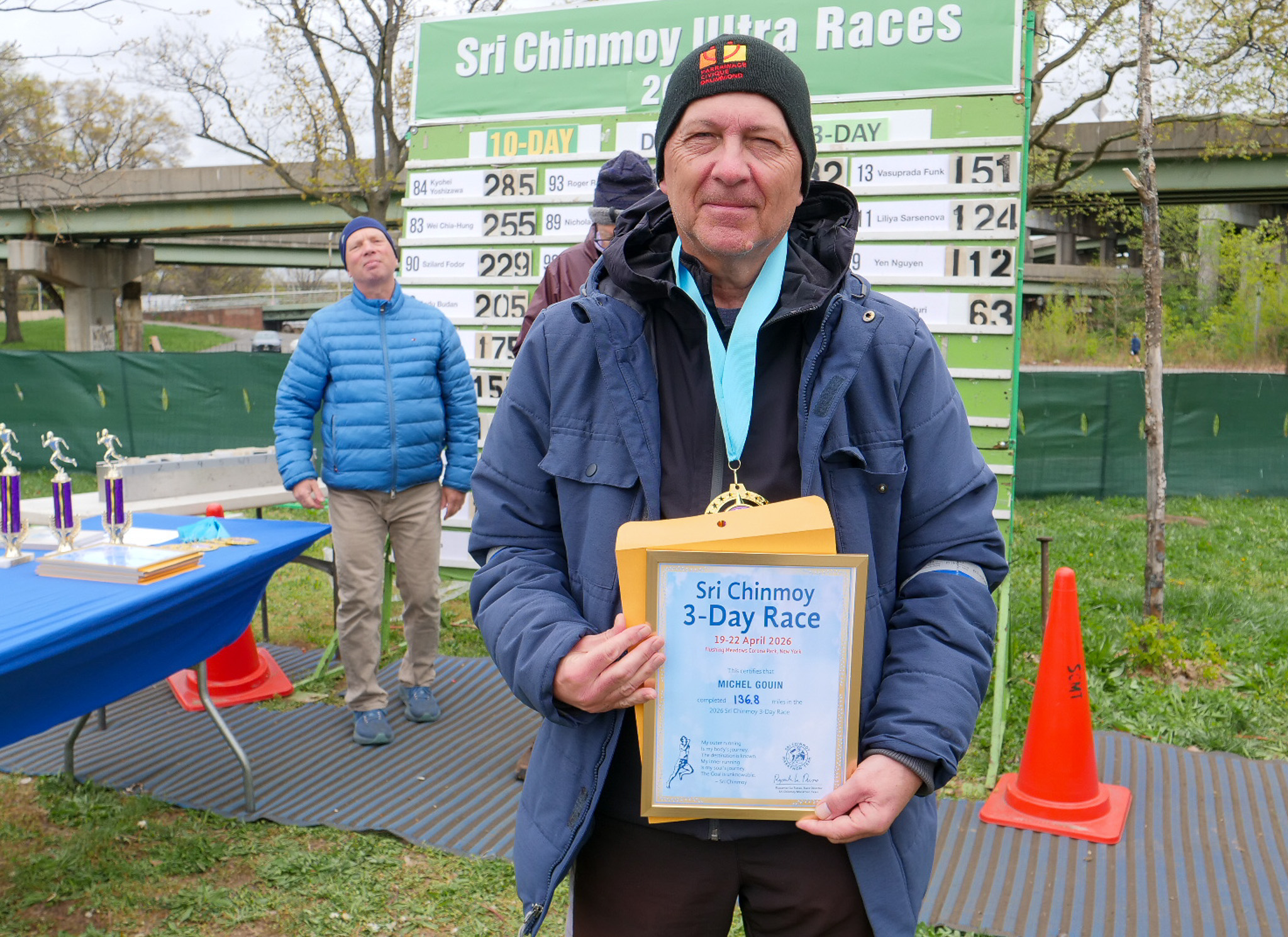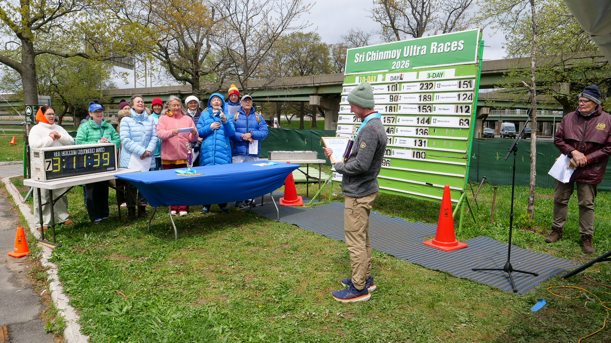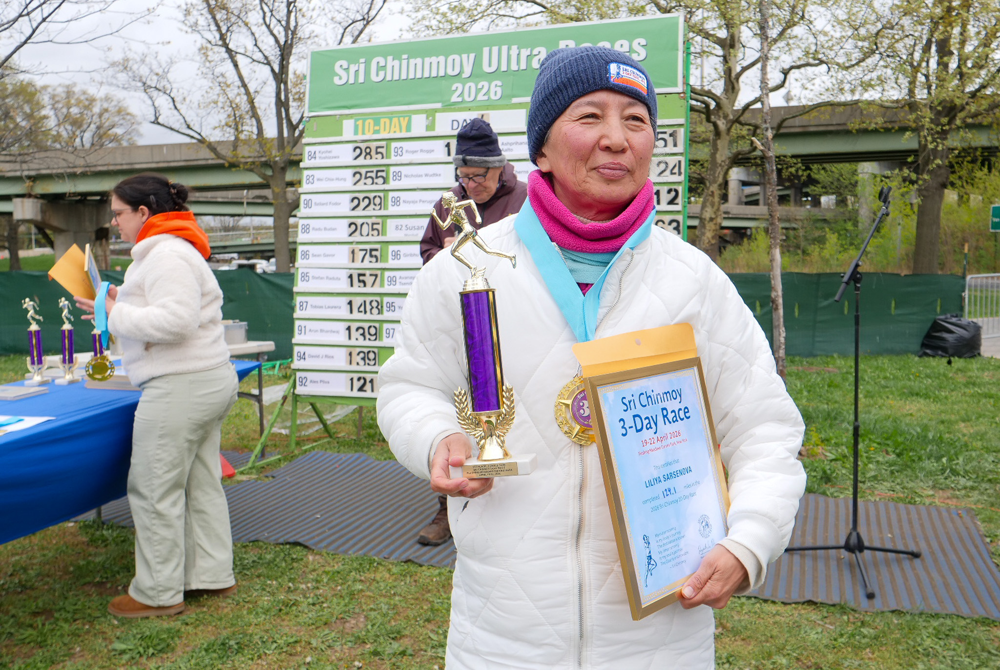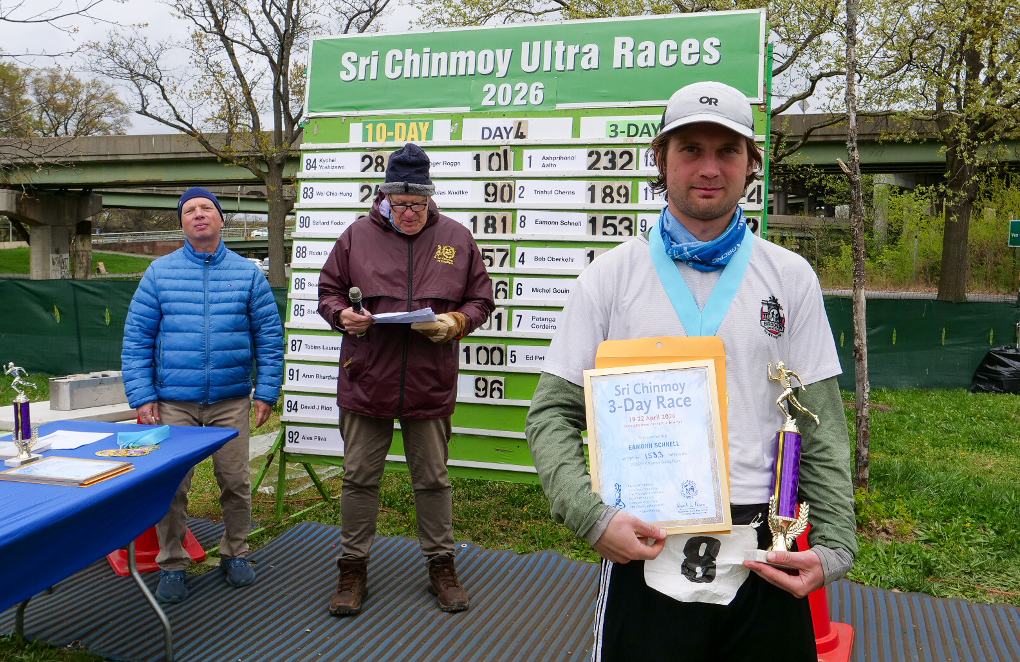 3 Day Race Results and PicturesDiksha Arturi 4th place 63.6 milesYen Nguyen 3rd place 112 milesLiliya Sarsenova 2nd place 125 milesVasuprada Funk 1st place 151 milesPatanga Cordeiro 6th place 131 milesMichel Gouin 5th place 136 milesBob Oberkehr 4th place 143 milesEamonn Schnell 3rd place 154 milesTrishul Cherns 2nd place 189 milesAshprihanal Aalto 1st place 232 miles10 day race continues and the 6 day race starts tomorrow