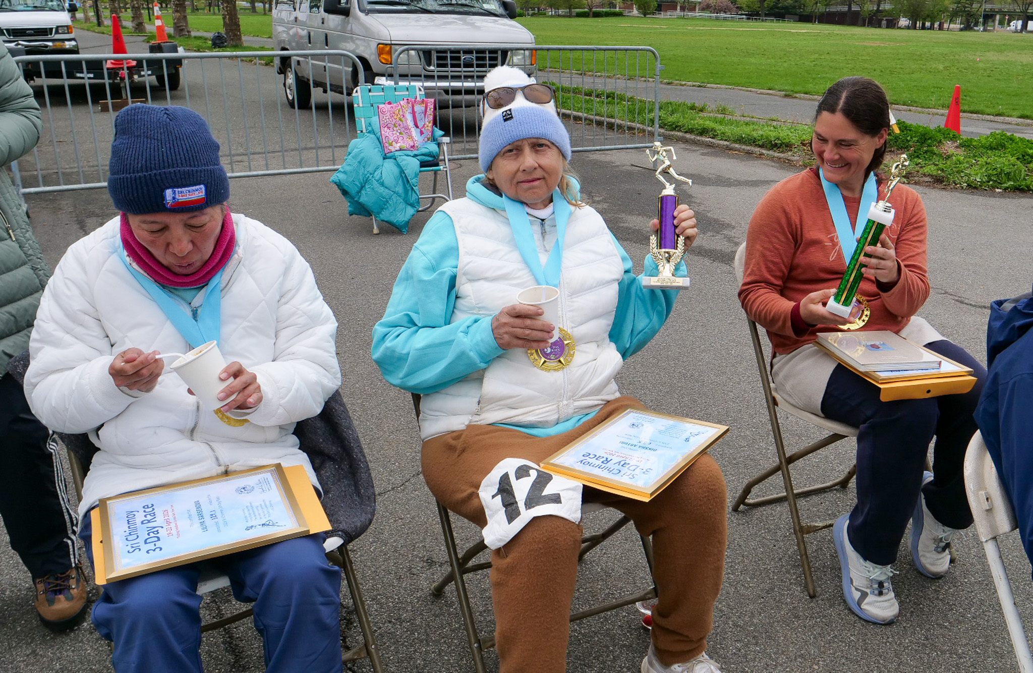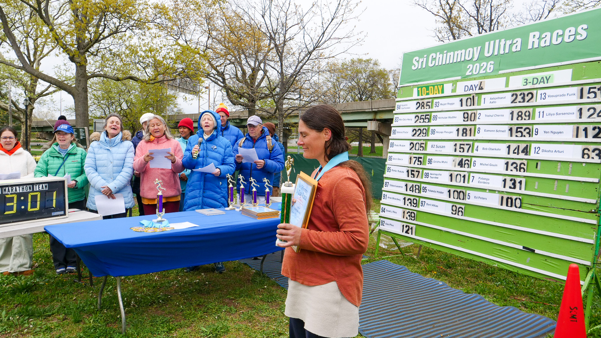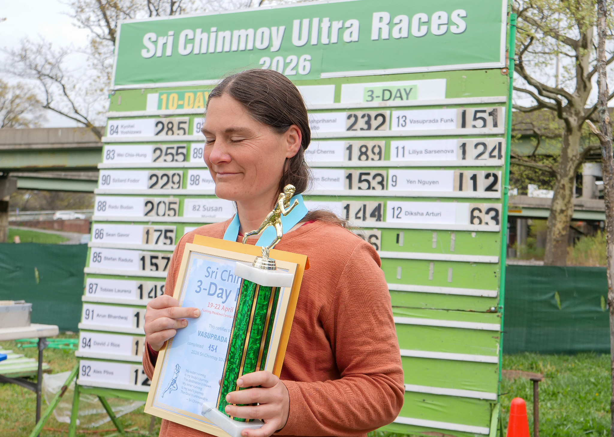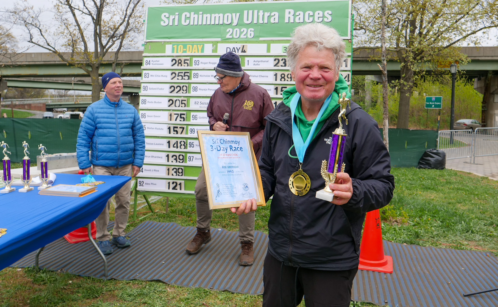 3 Day Race Results and PicturesDiksha Arturi 4th place 63.6 milesYen Nguyen 3rd place 112 milesLiliya Sarsenova 2nd place 125 milesVasuprada Funk 1st place 151 milesPatanga Cordeiro 6th place 131 milesMichel Gouin 5th place 136 milesBob Oberkehr 4th place 143 milesEamonn Schnell 3rd place 154 milesTrishul Cherns 2nd place 189 milesAshprihanal Aalto 1st place 232 miles10 day race continues and the 6 day race starts tomorrow